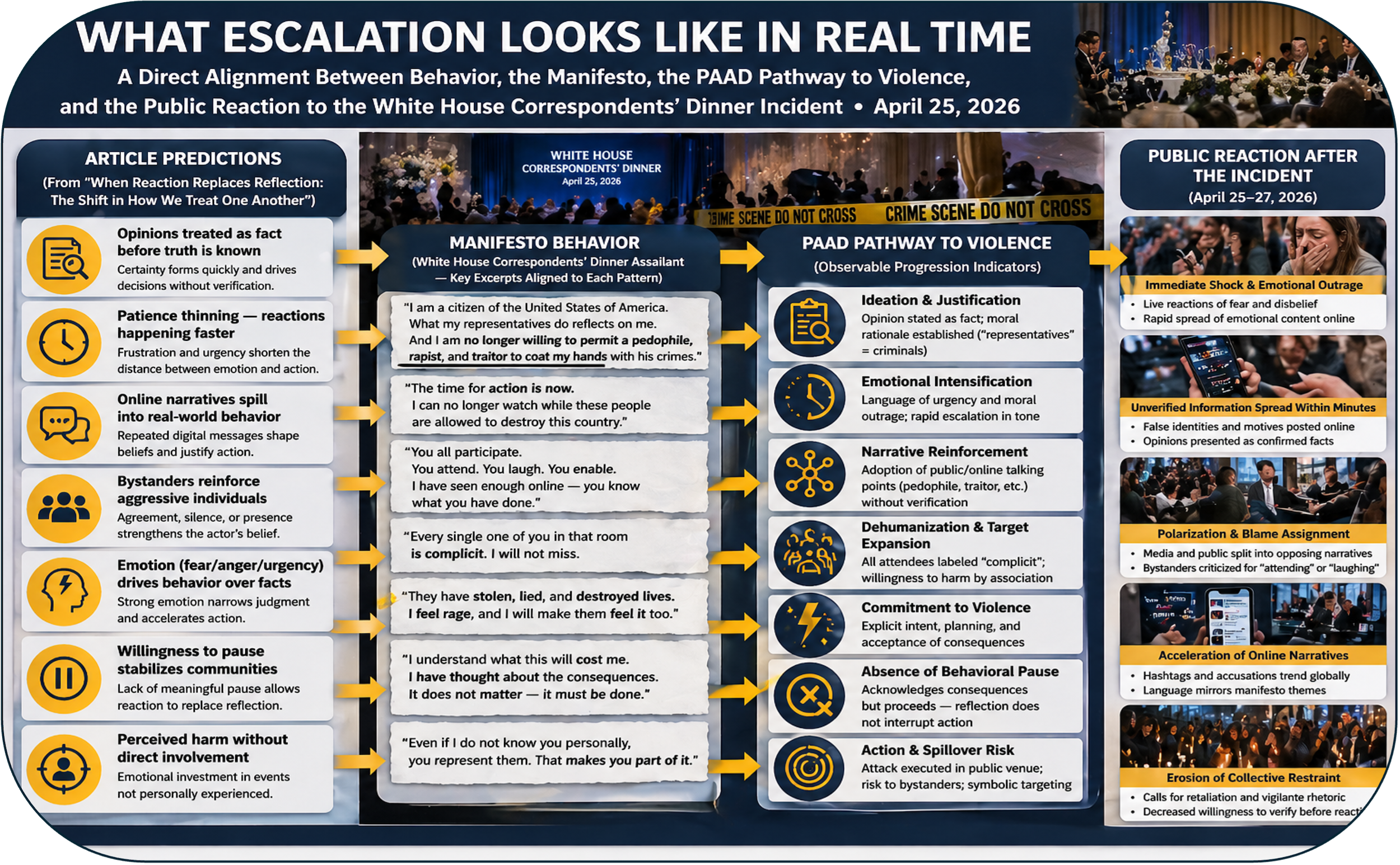 As with many high-profile events, the conversation that followed moved as quickly as the incident itself. Opinions formed quickly. Narratives began to take shape. Social media was filled with commentary, speculation, and strong reactions before many of the facts were fully understood. We examine how individuals responded before, during, and after the incident. It looks at how false narratives developed, how people who were not directly involved were pulled into the conversation, and how some reactions openly accepted harm or violence. Most importantly, it compares those behaviors to the patterns described in When Reaction Replaces Reflection, showing how the same cultural shifts discussed in that article can be observed in real time. This is not an investigation of the incident itself, but an examination of the environment surrounding it.